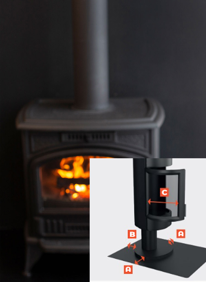 Le dimensionnement de la plaque de sol doit délimiter des distances de sécurité minimales (sur les cotés "A", à l'arrière de l'appareil "B", et sur la face avant "C", dite "zone de chargement"), en fonction de la taille de l'appareil de chauffage. (voir photo)