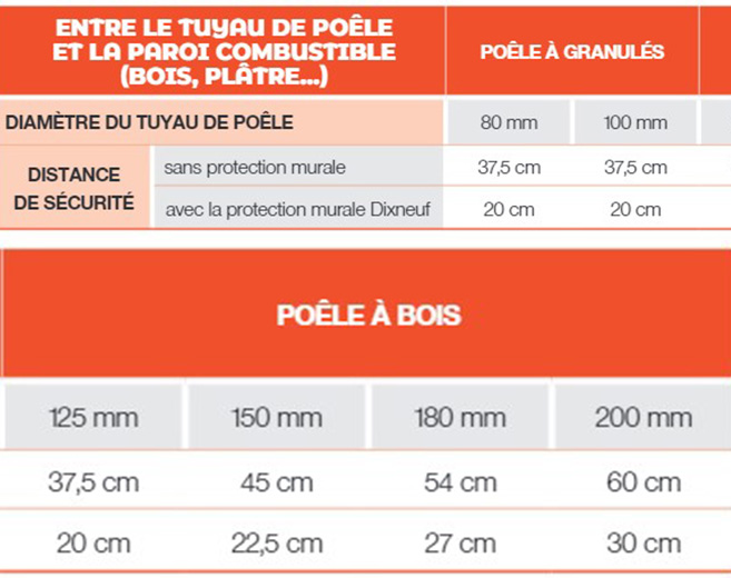 Pour la distance entre le poêle et la paroi combustible, sans protection murale, nous vous invitons à vérifier la distance préconisée par le fabricant de l’appareil dans le cas d’une paroi en matériau combustible.
