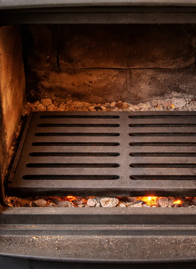 La grille foyère fait plus que simplement supporter les bûches. Placée au fond du foyer, elle laisse l'air circuler librement sous le bois grâce à ses ouvertures. C'est ce flux d'air, souvent sous-estimé, qui fait toute la différence : le bois brûle mieux, plus complètement, et la chaleur produite est bien plus homogène.
